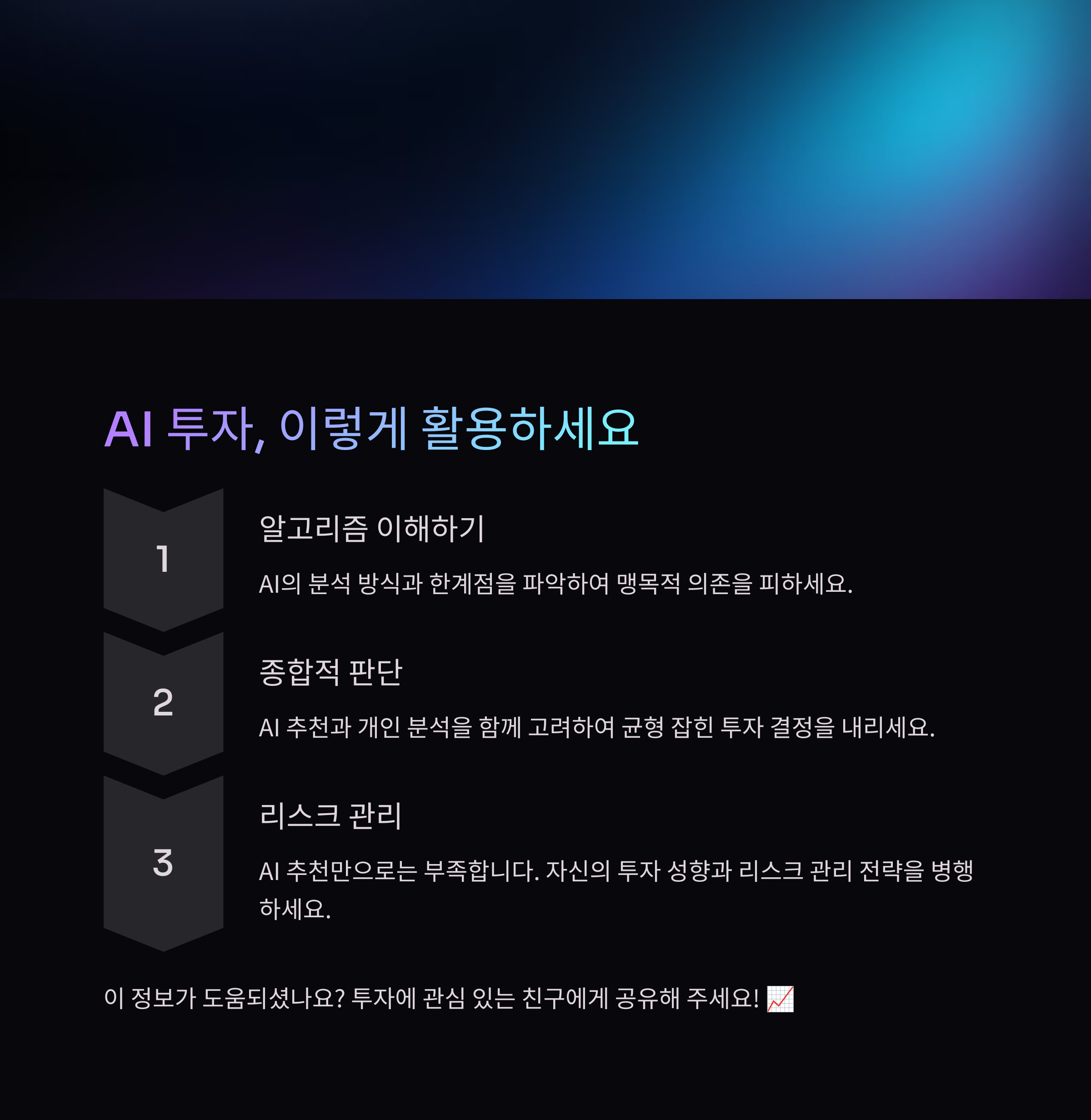 | AI가 종목을 분석하고 추천 | 데이터 품질이 AI의 성능을 결정 | AI 결과 + 개인 판단이 중요 |