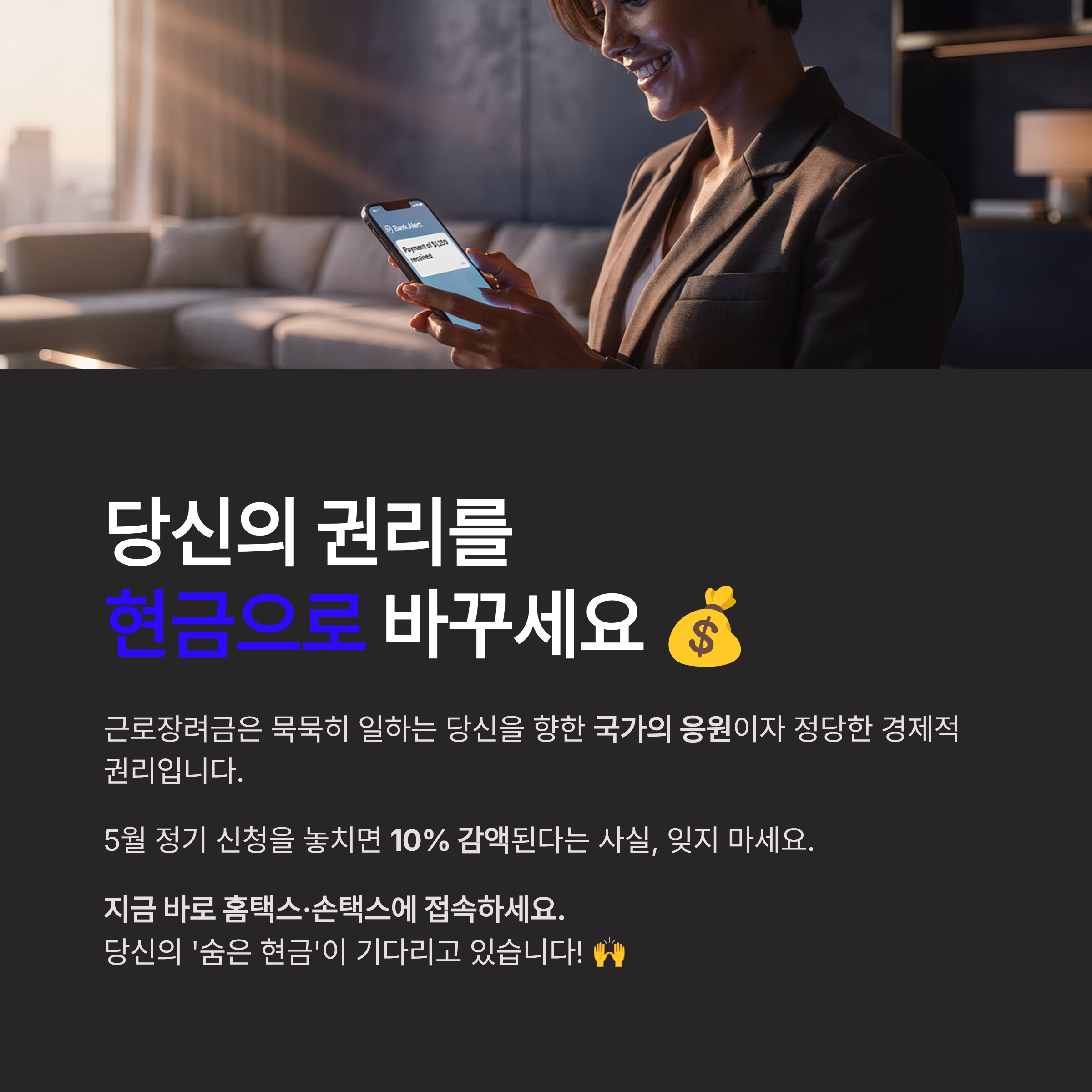 근로장려금은 단순 복지금이 아니라, 성실히 일하는 사람에게 주어지는 경제적 권리에 가깝습니다. 신청 기간을 놓치면 10% 감액될 수 있으니, 지금 바로 확인해보세요.