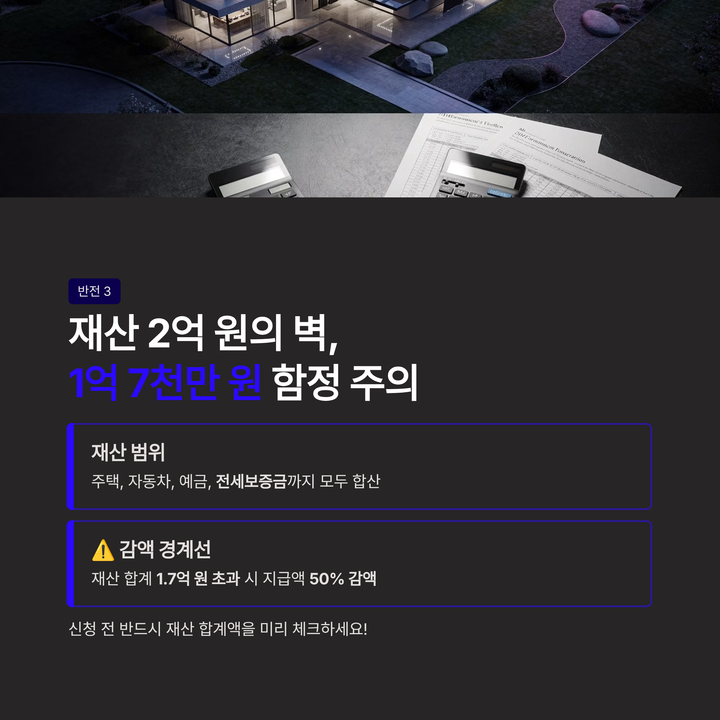 핵심: 재산 합계가 1억 7천만 원 이상이면 지급액이 50% 감액될 수 있습니다. “왜 이렇게 적게 나왔지?” 하는 경우가 대부분 이 구간입니다.